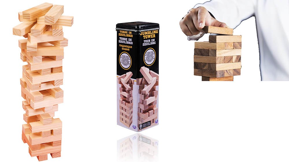 Construye con cuidado la torre cada vez más alta. El objetivo del juego es quitar un bloque en cada turno del centro o la parte inferior de la Torre de Equilibrio y colocarlo en la parte superior sin derribarlo. El juego continúa con los jugadores cada uno tomando un turno hasta que cae la torre. Cuando un jugador hace que la torre caiga, el jugador que fue antes que ese jugador es el ganador. Viene con 48 piezas de madera. Recomendado para dos o más jugadores, de seis años en adelante.