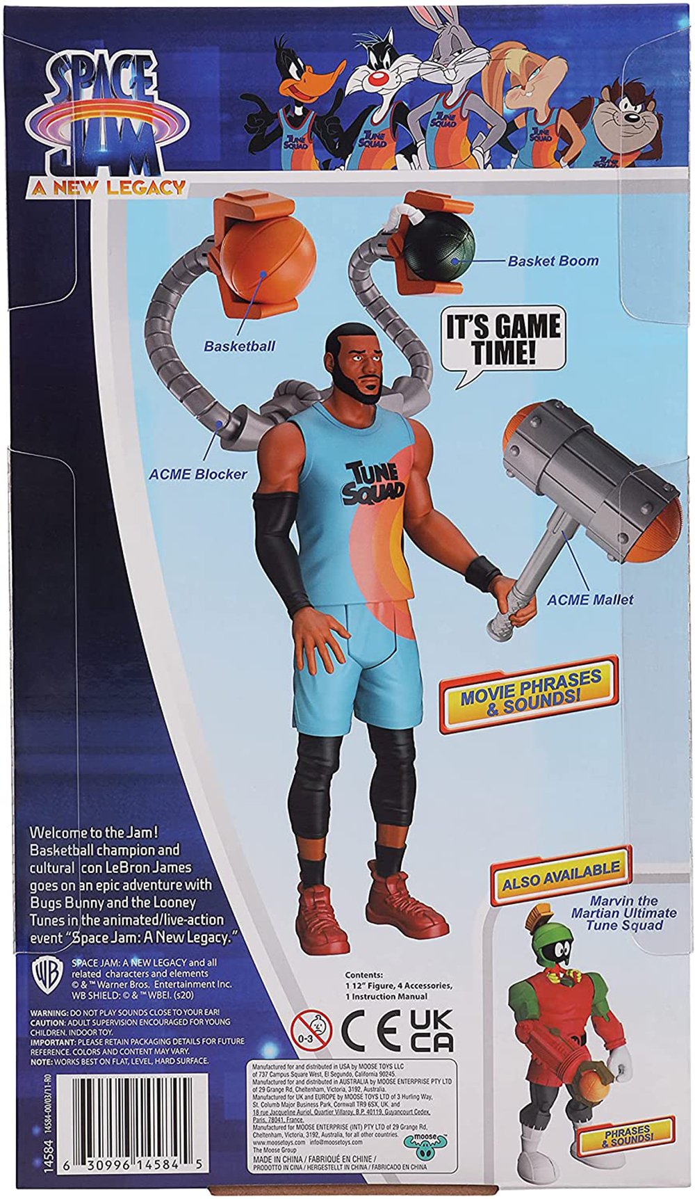 Bienvenido al Jam. Los Looney Tunes han vuelto y han unido fuerzas con el campeón de baloncesto LeBron James en una aventura épica del mundo cibernético en Space Jam: A New Legacy. Ahora puedes recrear algunos de los movimientos y escenas estelares de la película con esta enorme figura de acción de LeBron James Ultimate Tune Squad. Esta impresionante figura de juguete electrónico de LeBron mide 30 cm de alto con brazos y piernas articulados. Presiona su pecho para escuchar más de 8 sonidos y frases de la película. Con su camiseta de Tune Squad, viene con 4 accesorios geniales que se adhieren a su cuerpo. Conecte el ACME Blocker a la espalda de LeBron y coloque el Basketball y Basket Boom en las garras para que pueda enfrentarse a sus rivales. También puede sostener el ACME Mallet en su mano derecha. Ahora está completamente equipado para golpear la cancha.